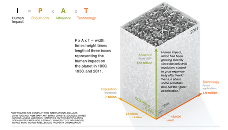 Le phénomène Anthropocène commence à prendre de l’envergure avec le début de la révolution industrielle qui provoque l’exode rural et le remembrement. Le point-clé ici il me semble est que l’humain prend le dessus sur la planète lorsqu’il se dénaturalise et se déterritorialise : alors que tous les êtres vivants consacrent la majeur partie de leur temps à l’alimentation, tout à coup l’être humain se détache de cette préoccupation et du territoire qu’il habitait, de la nature. La pseudo-science économique invente de nouvelles facons de vivre et d’exploiter et de dominer l’humain et la nature. puis prend une trajectoire logarithmique (accélération : augmentation de l’augmentation) dans la foulée de la deuxième guerre mondiale, ce que l’on appelle La grande accélération mais qui est davantage connu historiquement (jusqu’ici) et économiquement comme Les trente glorieuses.